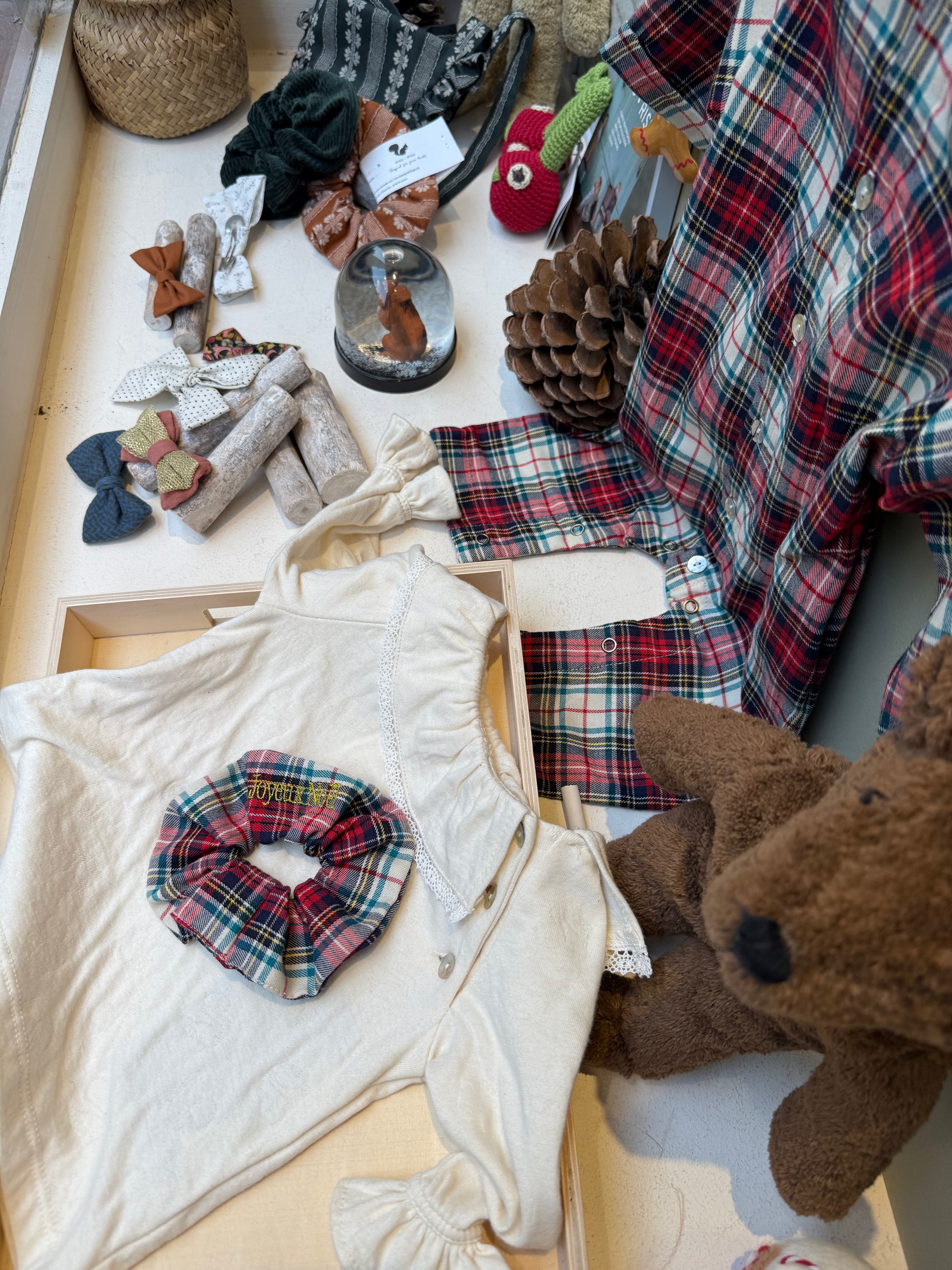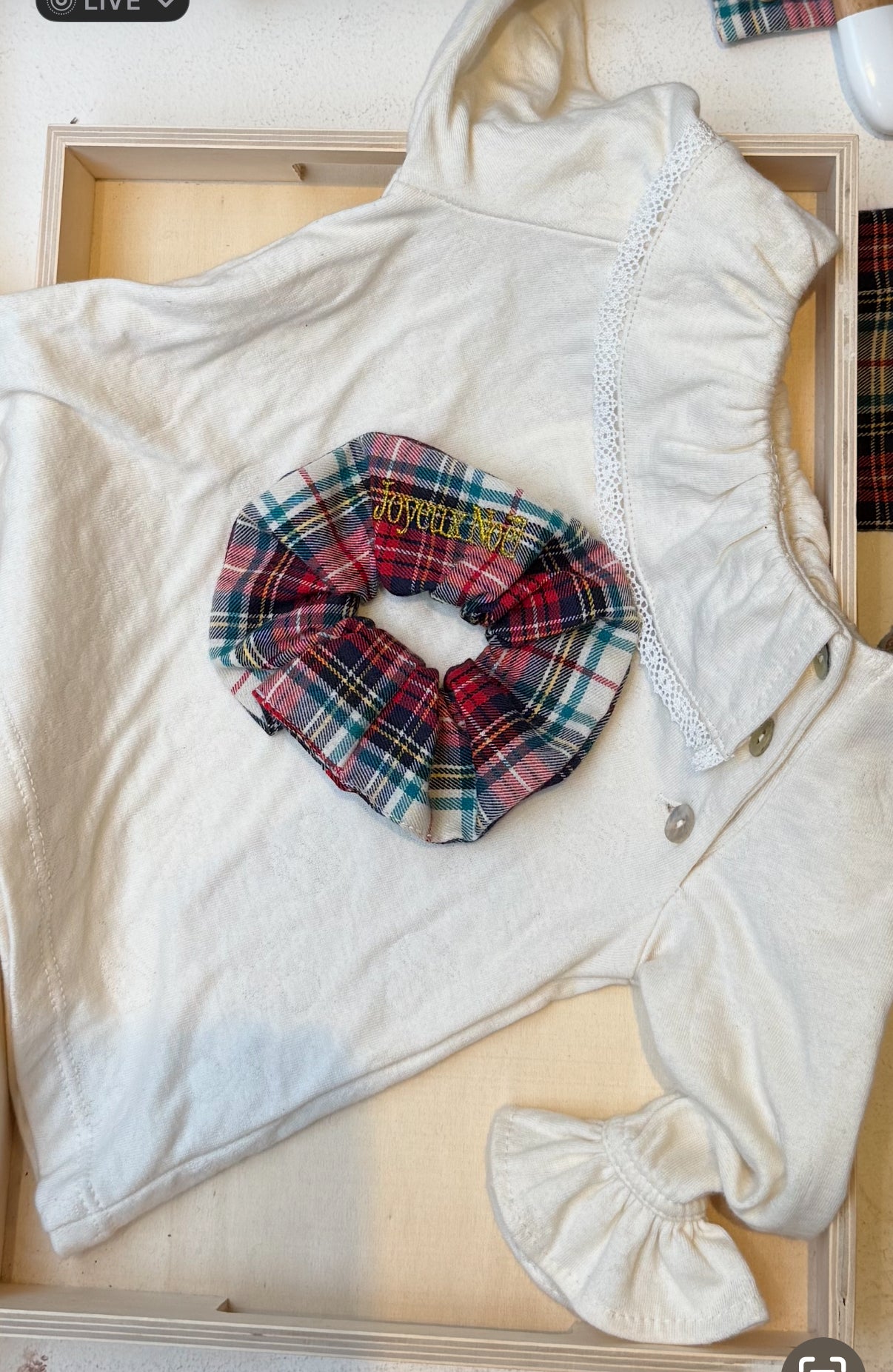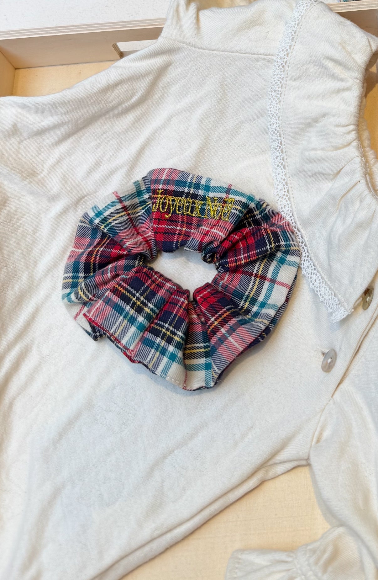 Merveilleux chouchou pour compléter les looks de Noël, en flanelle écossaise rehaussée d'une broderie dorée "Joyeux Noël".