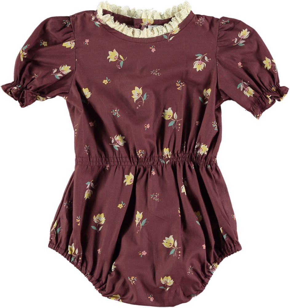 Adorable barboteuse bébé à porter tout l'été avec un col en dentelle de coton et son imprimé prairy, imprimé phare de l'été.