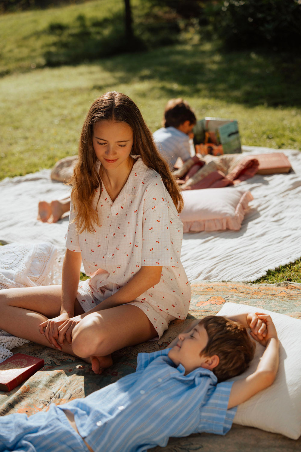 La ligne classique du pyjama Rieur est ici élégamment revisitée avec ce motif lumineux et gourmand de cerises rouges. Tout doux et confortable, ce pyjama a été confectionné dans une superbe double gaze de pur coton bio à double face. Il se compose d'un haut boutonné sur le devant et d'un short. Les boutons sont en nacre naturelle. Les cerises donnent du peps aux nuits d'été et conviennent à tous les enfants, l'imprimé a été réalisé en respectant un strict processus écologique |
