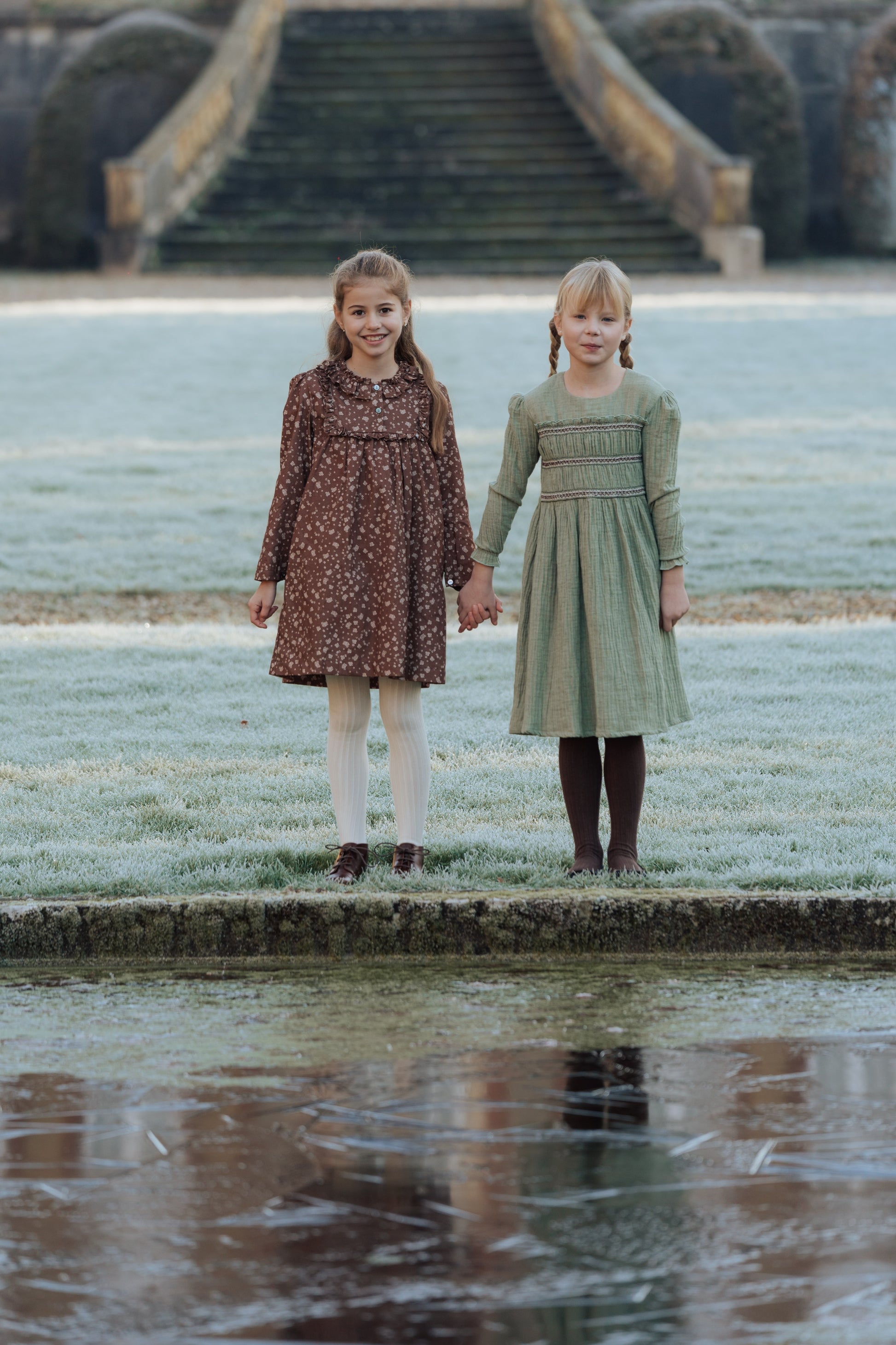 On adore son empiècement sur le devant rehaussé par une triple rangée de smocks chocolat, fruit d'un travail à 4 mains avec notre atelier espagnol.